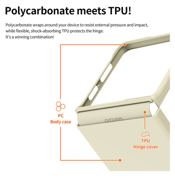 Polycarbonate wraps around your device to resist external pressure and impact, while flexible, shock-absorbing TPU protects the hinge. It's a winning combination!