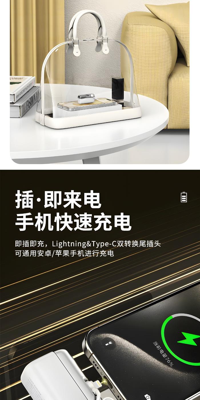 Fast phone charging Plug and play, Lightning & Type-C convertible tip, compatible with Android/Apple phones for charging.