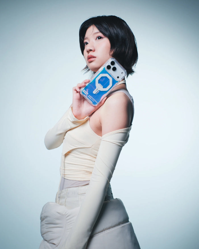 Tech protection turned everyday statement piece with MYST's sheen of iridescence. Semi-clear protective case with a magnetic ring module designed for wireless charging. Customizable with interchangeable corner bumper lanyard loops to sling it on.
